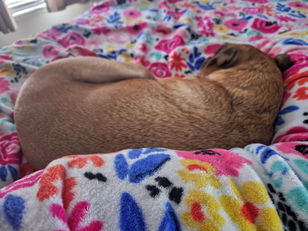 Image of my dog curled up beside me while I blog. He’s being shy right now.