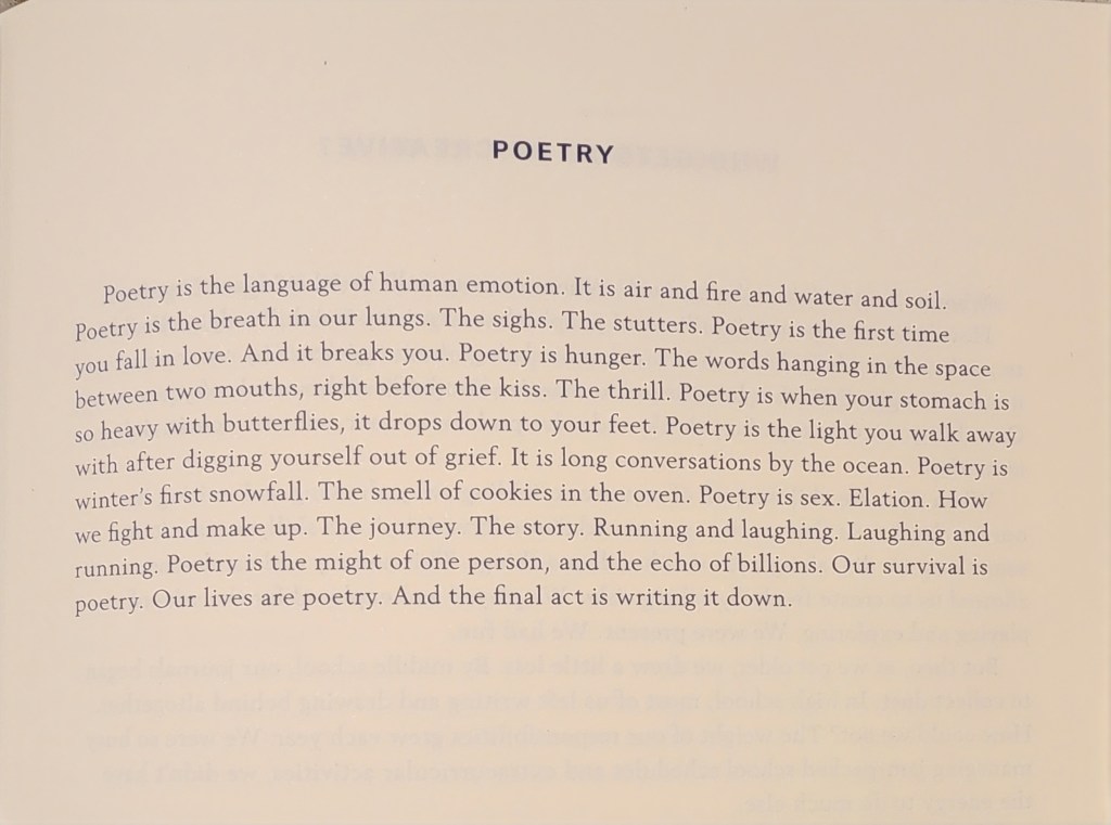 Rupi Kaur is an inspiration to me as her writing style creates a vivid story for readers. Her illustrations are relevant to her words. I find meaning and depth through her poetry which gives me spiritual guidance in my own life. This particular book “Healing Through Words” is about learning how to write and illustrate step by step emotionally beginning with a few words of your choice of how certain things make you feel and think. It’s like a journal that pushes you to create how to display your reactions and emotions towards certain experiences in that have affected you. She also tells the story of what inspired her to start writing and how it was not easy to tell her personal trials and tribulations which I can relate to genuinely. It’s a good read so I advise you to check it out as it may give you some insight and motivation if you are having a tough time releasing some of your inner feelings though the art of poetry or short story writing and illustration. Her introduction which is included below describes poetry in such a powerful and invigorating way that absolutely moves you. Let me know if you are a fan of her work or feel free to enlighten me on some of your favorite poets that I may be missing out on.
